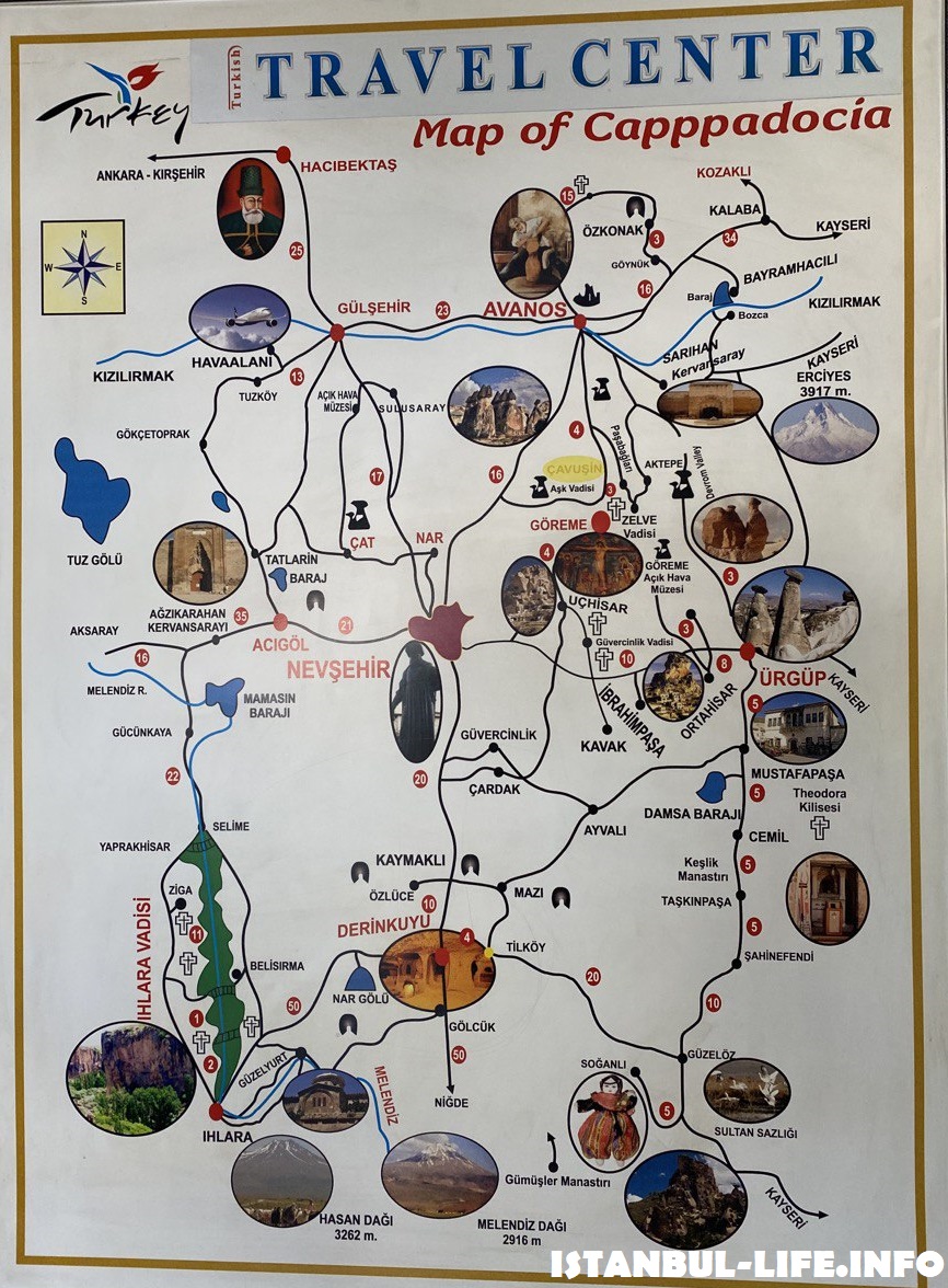 Достопримечательности Каппадокии на карте, в том числе все главные города: